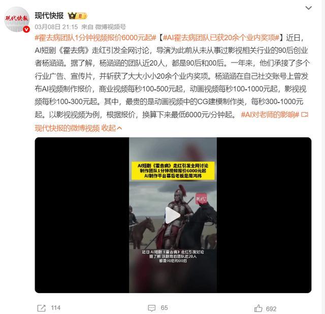 近日,AI短剧《霍去病》走红引发全网讨论,导演为此前从未从事过影视相关行业的90后创业者杨涵涵。据了解,杨涵涵的团队近20人,都是90后和00后。一年来,他们承接了多个行业广告、宣传片,并斩获了大大小小20余个业内奖项。杨涵涵在自己社交账号上曾发布AI视频制作报价,商业视频每秒100-500元起,动画视频每秒100-1000元起,影视视频每秒100-300元起。其中,最贵的是动画视频中的CG建模制作类,每秒300-1000元起。以影视视频为例,根据报价,换算下来最低6000元/分钟起。