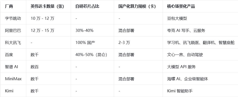 最后看AI独角兽,智谱AI依托于清华的技术背景,拥有数千张英伟达卡,专注在学术与产业融合的应用场景上;而Kimi的母公司月之暗面则是通过融资快速扩展算力,并以英伟达显卡为硬件优化了MoE模型架构,依靠高效的并行计算能力,在长文本处理领域形成了自己的优势。Minimax同样以英伟达卡为基础,支撑其大模型的快速迭代与高效推理,在成本与性能平衡上构筑了自身竞争力。