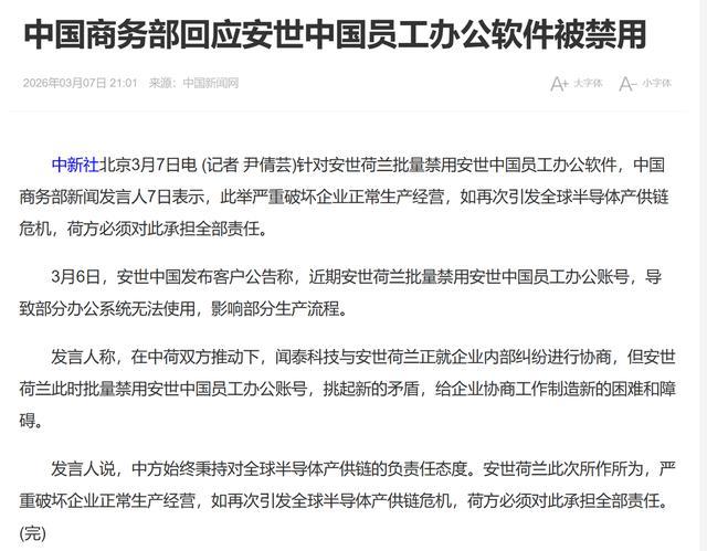 中国商务部在次日迅速作出强硬回应,明确指出此举“严重破坏企业正常生产经营”,并警告称,如果因此“再次引发全球半导体产供链危机,荷方必须对此承担全部责任”。